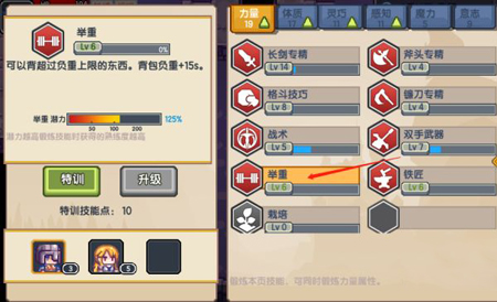 (友情提示:开局角色如果选择钢琴师,举重技能等级天生比较高,如果开局没有举重技能,可以在约恩村找技能训练师学习。)